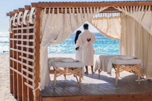 Offer is subject to availability and the terms stated herein. The Spa Day Pass is valid from 10:00 AM to 6:00 PM and includes access to designated pools, beach club, and spa areas, one 50-minute custom massage, and 20% off food and beverages during the visit.